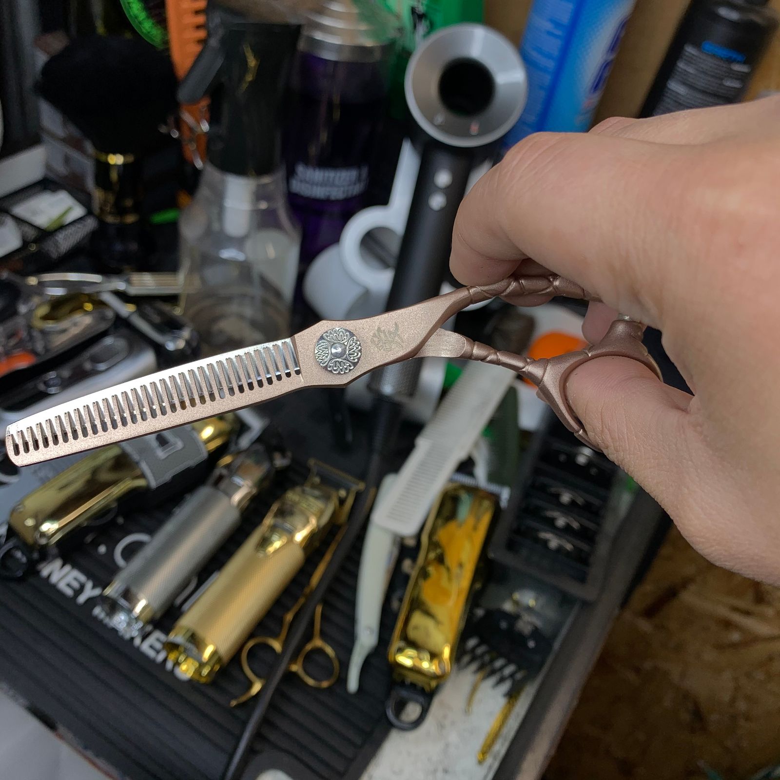 The Japanese Divine Being Nova Rose Gold Thinning Sword is a texturizer that specializes in creating and refining soft texture for your clients. Comprised of 27 teeth and a premium high-carbon Japanese stainless steel, this shear is designed to take out approximately 40 percent of hair.